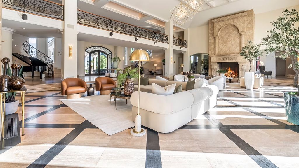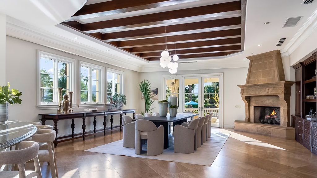 From the moment one steps inside, the estate delivers a sense of cinematic grandeur. A dramatic great room with soaring 24-foot coffered ceilings anchors the home, creating a central gathering space that feels both expansive and intimate.