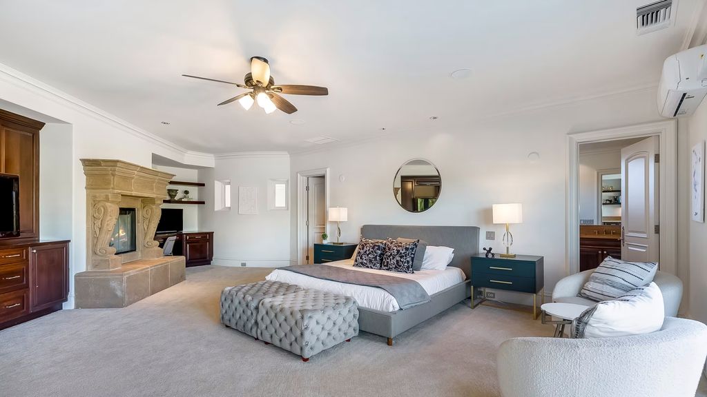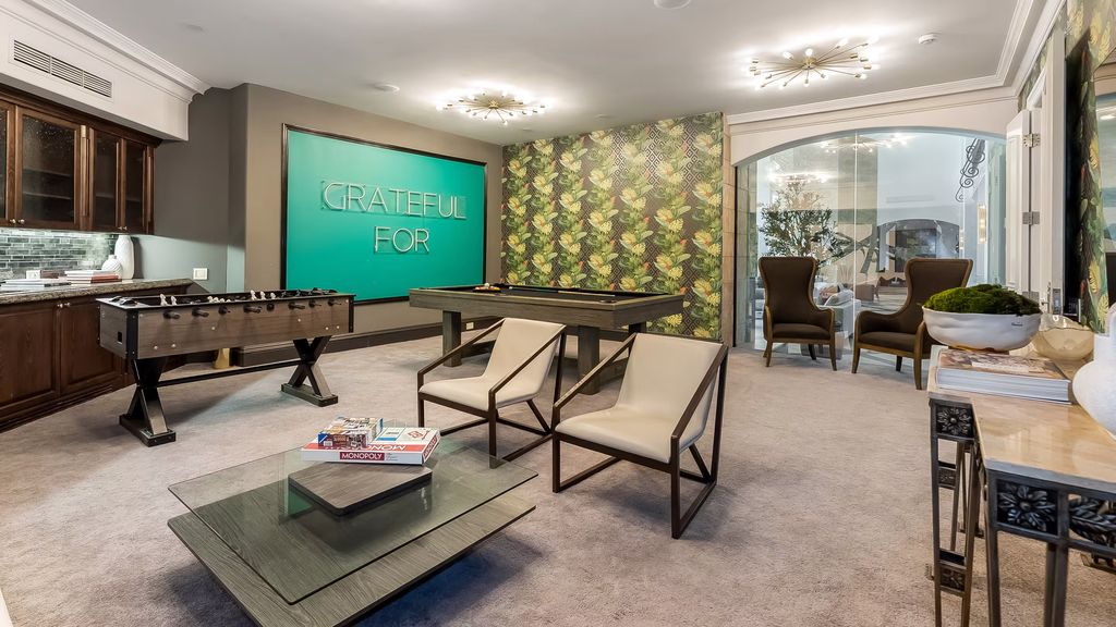 The architectural language leans toward classic Mediterranean, yet the interiors incorporate modern luxury elements, including a temperature-controlled wine cellar, a dedicated home theater, and a game room designed for large-scale entertaining. The primary suite functions as a private retreat, complete with its own fireplace, office, wet bar, and a secluded hot tub terrace.