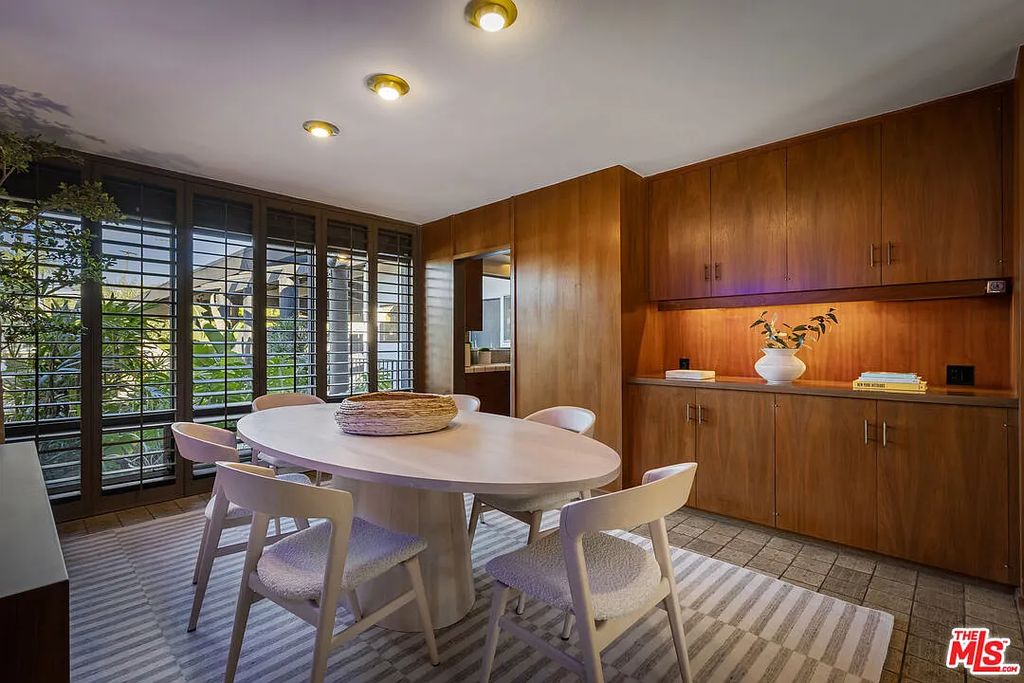 Adjacent to the kitchen, the formal dining room offers a more structured setting, framed by full-height wood cabinetry that provides both storage and architectural rhythm. Within the Colman Domingo Downey home, these dining spaces are not isolated—they are integrated into the broader spatial experience, supporting both everyday living and larger gatherings.