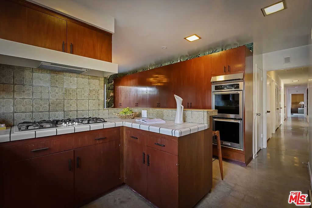 The kitchen within the Colman Domingo Downey home reflects a philosophy of preservation rather than reinvention. Rich teak cabinetry defines the space, paired with tiled countertops and backsplash that maintain the home’s original character.