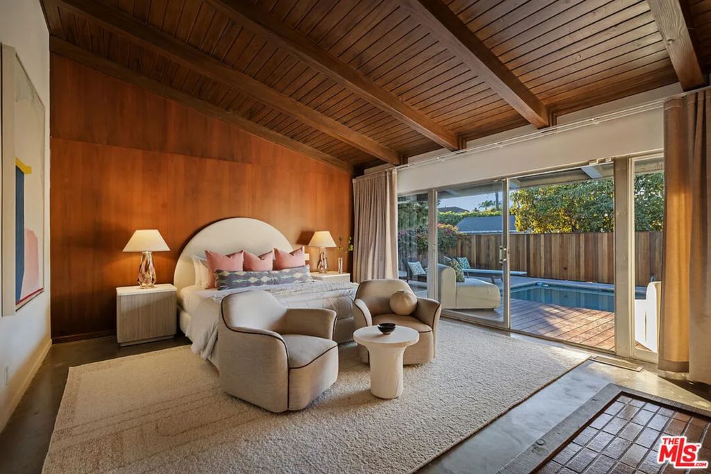 The primary suite in the Colman Domingo Downey home serves as a private sanctuary that embodies the essence of midcentury design. Exposed beams, wood-paneled walls, and direct access to the pool deck create a seamless connection between indoor comfort and outdoor relaxation.