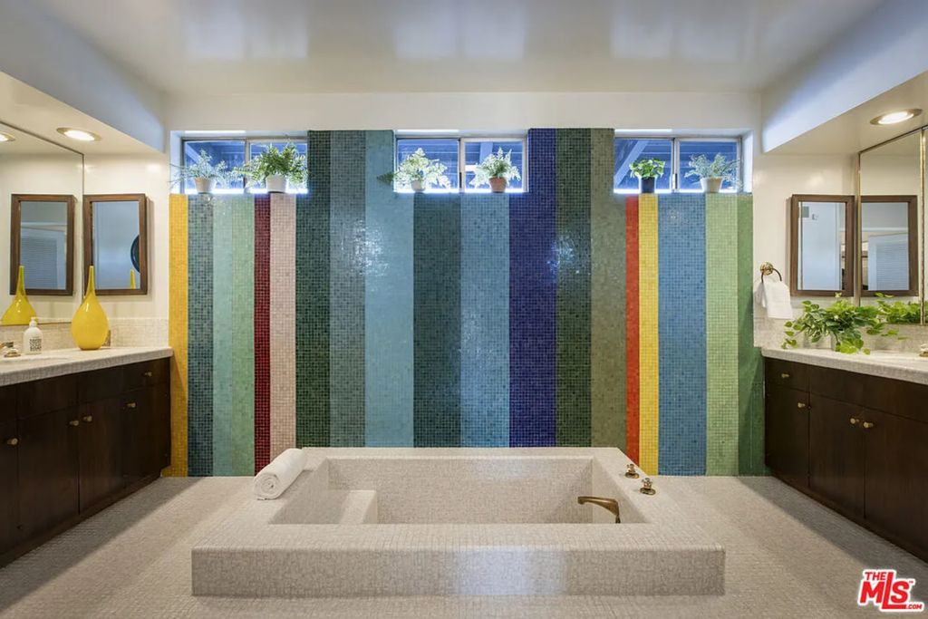 In the en-suite bathroom, the Colman Domingo Downey home reveals one of its most distinctive features: a wall of multicolored tiles sourced from remnants of installations by artist Charles Kratka at Los Angeles International Airport. This detail connects the residence to a broader narrative of Los Angeles design history.