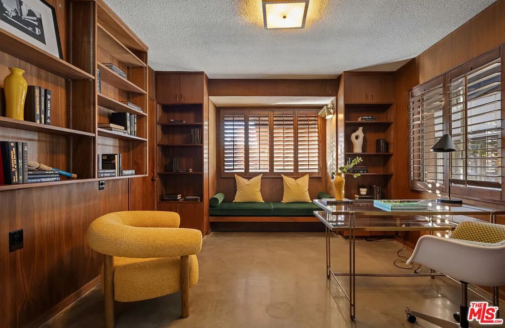 Nearby, a front lounge introduces a more intimate atmosphere, framed by warm wood paneling and carefully positioned windows that capture greenery from the front yard. The transition between these spaces within the Colman Domingo Downey home feels fluid, reinforcing the architectural intention behind the original design.