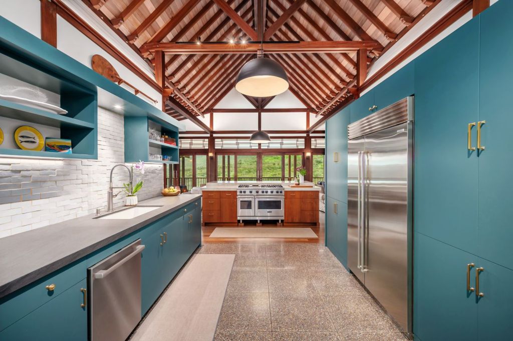 The heart of the Dan Mindel Kauai Estate lies within its recently remodeled designer kitchen, which unfolds beneath the exposed-beam ceiling along a central axis. Custom teal cabinetry stretches across both walls, accented by brass hardware and a crisp white brick backsplash that enhances the modern island aesthetic.
