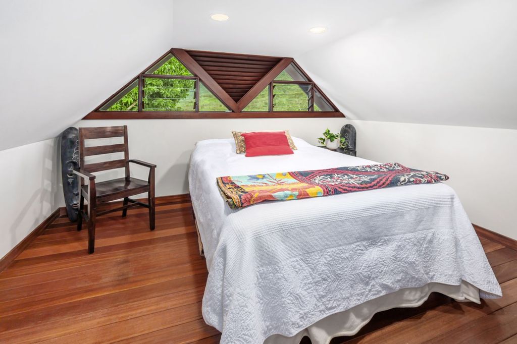 A guest bedroom tucked beneath the roofline showcases the home’s signature triangular window detailing. The pitched ceiling and operable wood louvers allow airflow while maintaining privacy, further reinforcing the estate’s connection to its island surroundings.