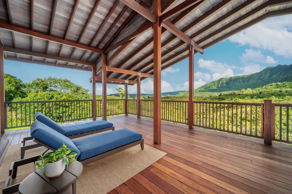 Outdoor living plays a central role in the Dan Mindel Kauai Estate lifestyle experience. A 1,200-square-foot Ipe hardwood lanai stretches across the entire width of the main residence, functioning as an outdoor living room, dining area, and relaxation space.