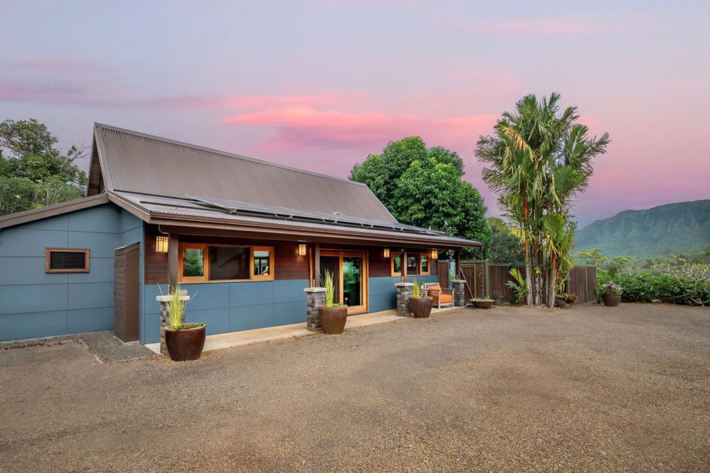 The Dan Mindel Kauai Estate incorporates multiple environmentally responsible design features. A 24-panel solar system with battery backup supports the home’s energy demands, while durable metal roofing enhances long-term sustainability and weather resilience.
