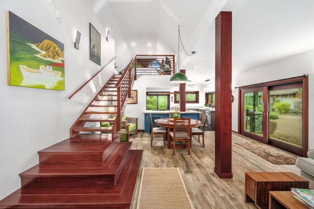 Above the workspace, a loft area provides additional sleeping quarters or studio space. Listing representatives shared with californialuxuryhouses that this structure has been particularly appealing to creative professionals seeking live-work flexibility in Kauai.