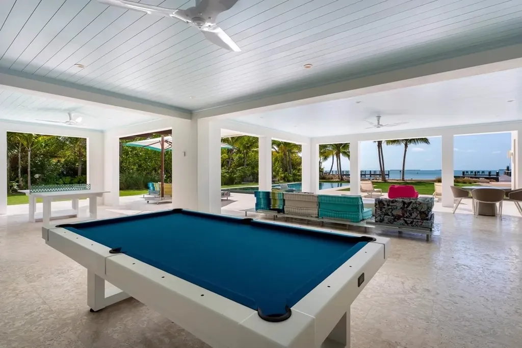 Among the standout amenities: a media room with blackout shades, a tackle room for fishing gear, two laundry rooms, and a four-car garage. The outdoor living spaces include a covered kitchen with a brick pizza oven, flat grill, and smoker, all designed for laid-back Keys entertaining.
