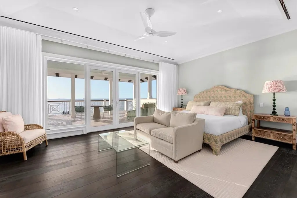 The primary suite features floor-to-ceiling windows, a marble-clad bathroom, and a soaking tub overlooking the water. A large walk-in closet provides ample room for the media mogul’s wardrobe—plus space for his dogs’ designer gear.