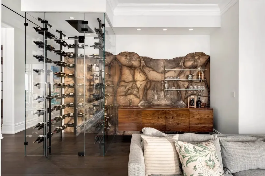 Inside, the open living area boasts a 180-bottle glass-front wine cellar, handcrafted wood bar, and a Sonos sound system for entertaining. The chef’s kitchen is a showcase of craftsmanship, with marble and dolomite countertops, a custom mosaic backsplash, and a wine tap built into the island.
