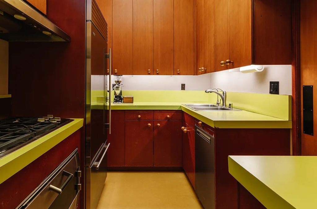 The main house spans roughly 2,000 square feet with three bedrooms and embodies classic midcentury design through walls of glass, clerestory windows, and a minimalist blend of natural wood and metalwork. A living room anchored by a soaring wood-beam ceiling and a sculptural fireplace opens to a fountain-clad patio, while a connected dining area leads to a galley-style kitchen adorned with vibrant chartreuse countertops. Every detail reflects the distinctive character that inspired Lynch throughout his four-decade residency.