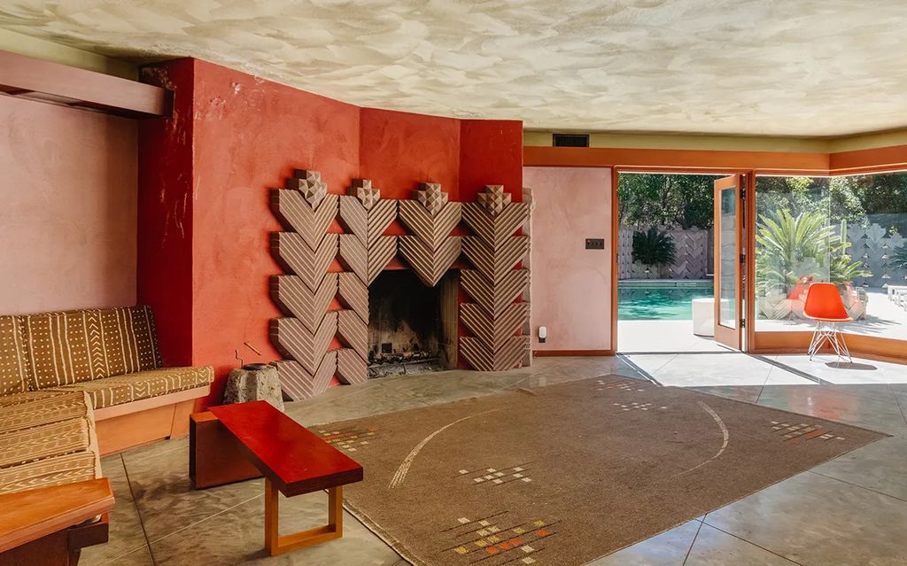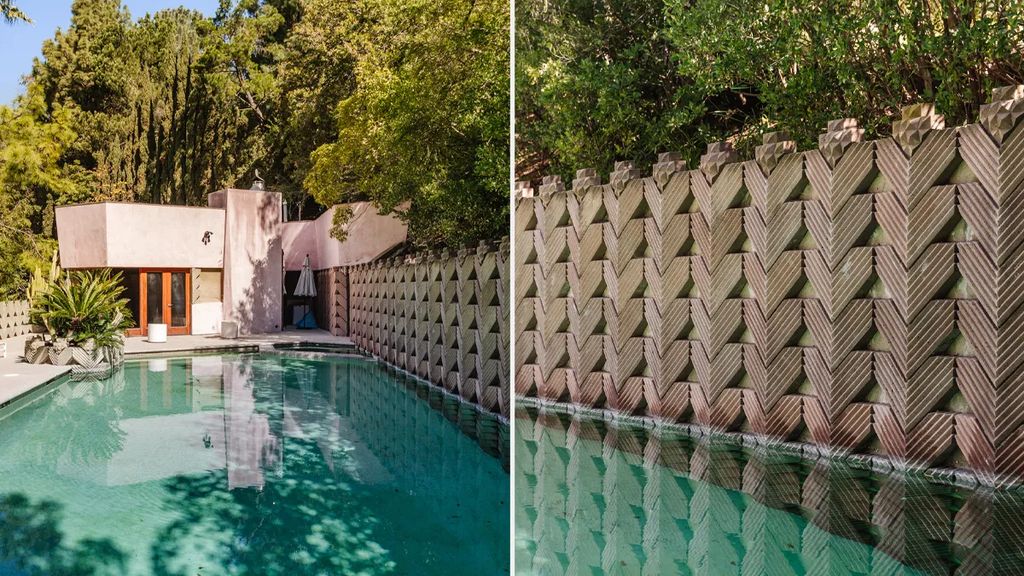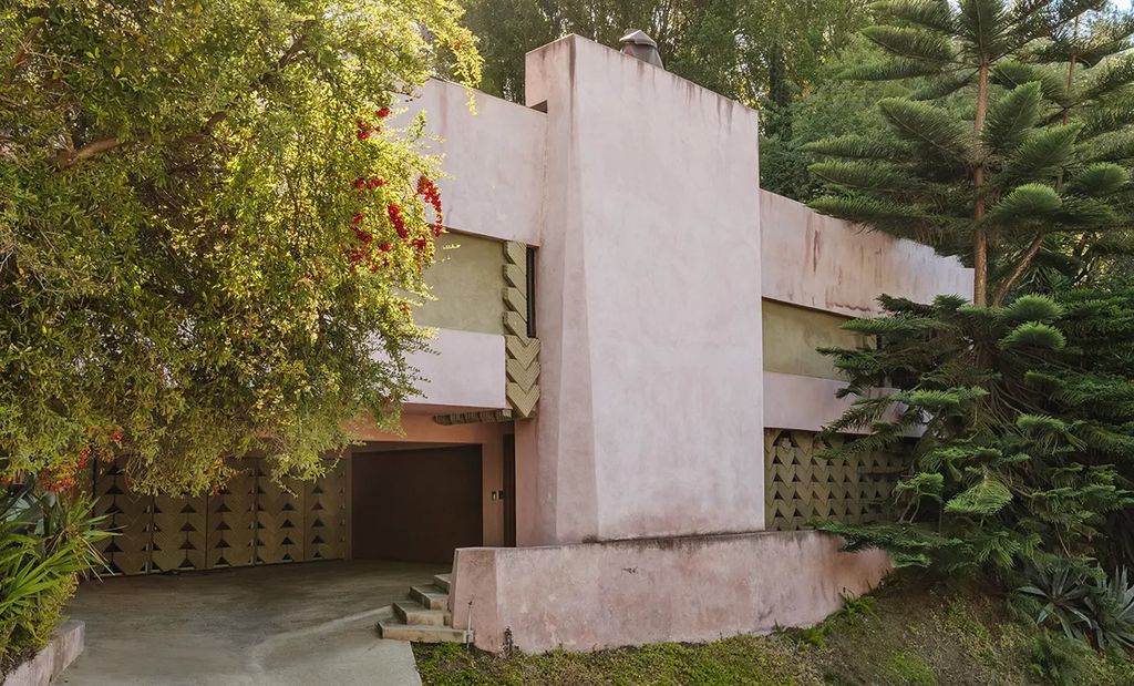 Tucked away on five contiguous hillside parcels totaling more than two acres, the gated property lies just below Mulholland Drive in the prestigious Outpost Estates neighborhood. At its heart stands the Marilyn Johnson House, a striking midcentury residence designed in the early 1960s by Lloyd Wright, the eldest son of the legendary Frank Lloyd Wright. Lynch purchased the pink-hued dwelling in 1987 for $560,000, according to The Wall Street Journal, and the home is now recognized by Historic Places LA as an “excellent example of Mid-Century Modern residential architecture.”