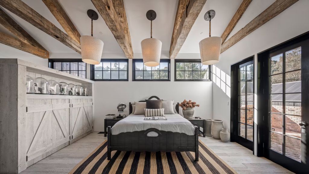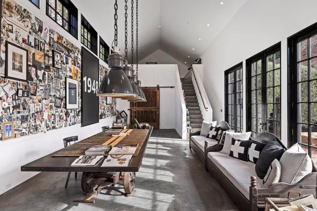 Diane Keaton’s farmhouse merges modern architecture with classic elements of a traditional California residence. Interior spaces flow seamlessly from room to room, punctuated by custom woodwork, expansive windows, and vaulted ceilings that invite natural light into the heart of the home. The kitchen, a centerpiece of the property, combines sleek cabinetry with professional-grade appliances, reflecting Keaton’s personal tastes and penchant for entertaining.