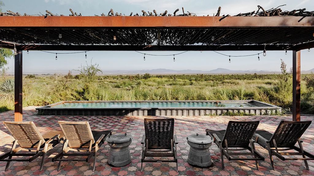 Beyond the interiors lies a landscape designed not merely for recreation, but for contemplation. A shipping-container lap pool serves as the estate’s sculptural centerpiece, offering uninterrupted mountain vistas as you swim. Nearby, a spa, fire pit, and screened palapa create anchor points for long evenings under the desert sky.