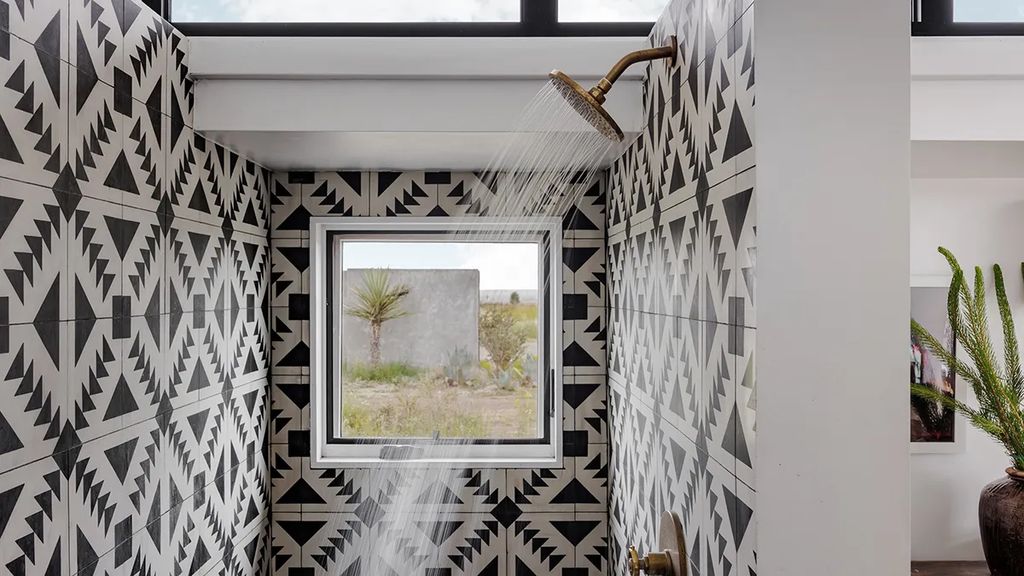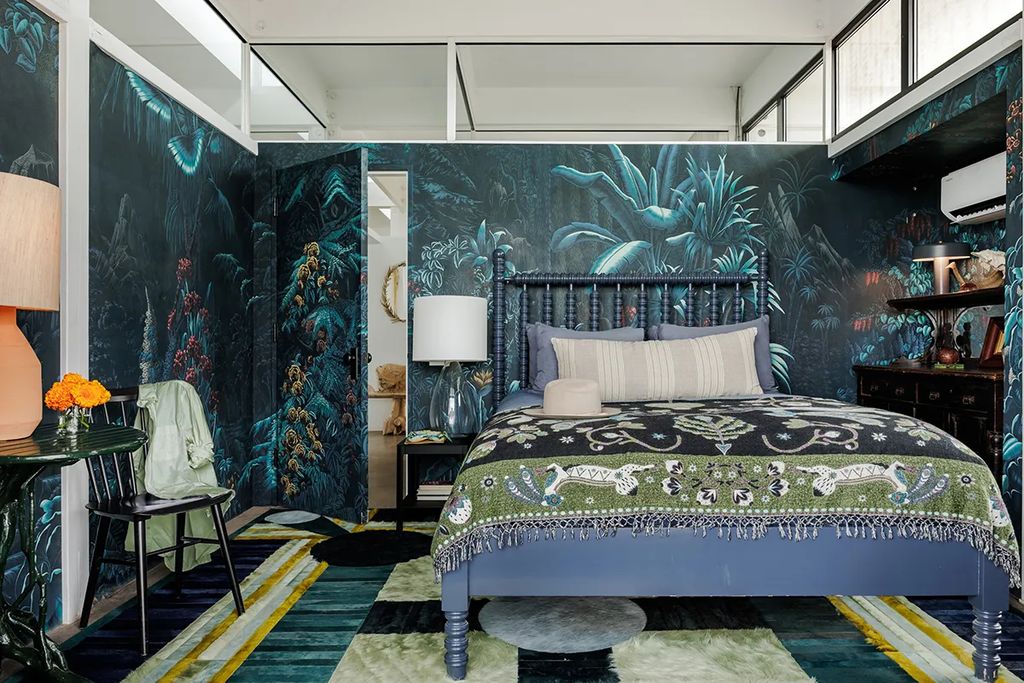 Further inside, the primary bedroom offers a sense of quiet luxury, complete with an en suite bathroom showcasing brass fixtures and bold geometric tiles. The two additional bedrooms feature expressive floral wallpapers and direct access to the patio, allowing every guest a private connection to the landscape.