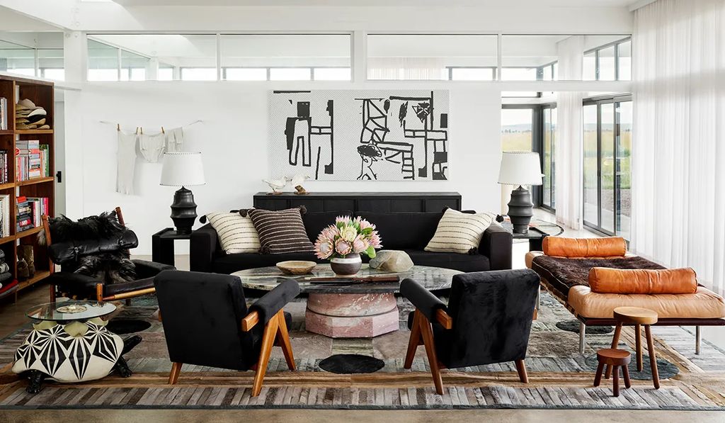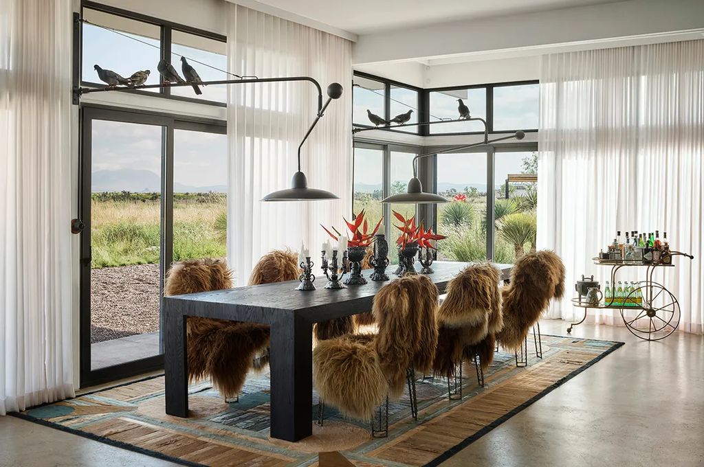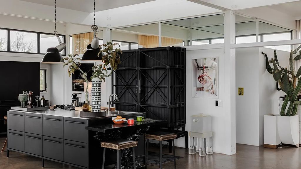Panoramic glazing invites sunlight to sweep across the polished concrete floors, shifting the character of each room throughout the day. The layout includes three bedrooms and two bathrooms, each space styled with Friedman’s signature pairing of rustic textures and modern refinement.