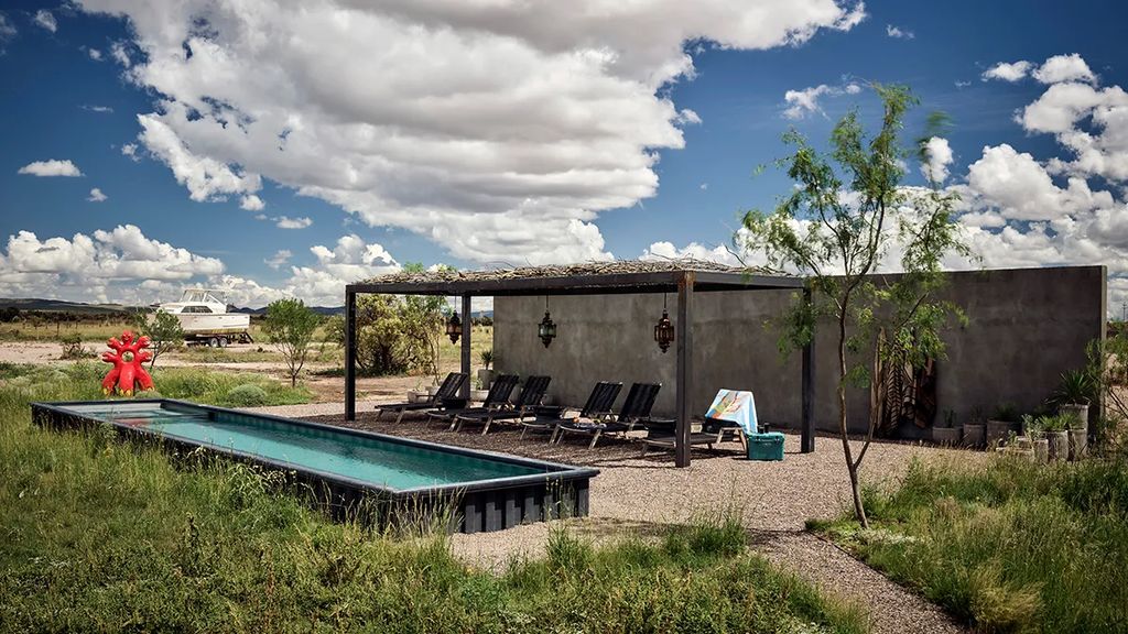 A Donald Judd-inspired pavilion pays homage to one of Marfa’s most influential figures. Judd’s arrival in the 1970s transformed the town into a global hub for minimalism, and Friedman’s pavilion echoes that legacy—clean lines, honest materials, and an intentional relationship with the land.
