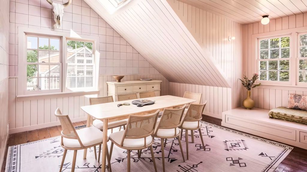 The seven-bedroom layout favors warmth and livability over ostentation. Additional interior spaces include a living room with a brick fireplace, a whimsical pink dining room crowned by a sloped ceiling and skylight, a cozy den, and multiple flexible-use areas suited for entertaining or quiet retreat.