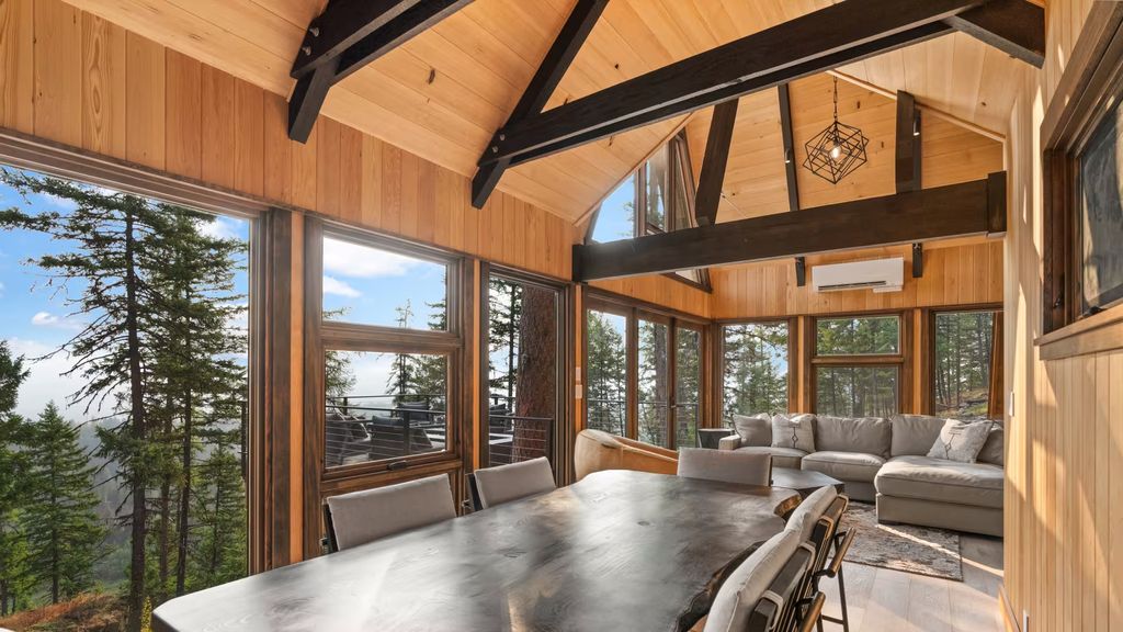 Large windows throughout the home frame uninterrupted views of the surrounding forest and mountains, allowing natural light to filter deep into the living spaces. A handcrafted live-edge wood dining table anchors the main living area, reinforcing the home’s emphasis on material honesty and artisanal detail.