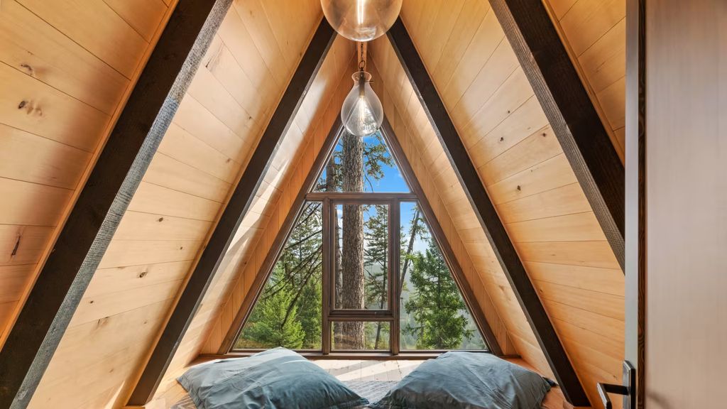 Inside, the Drew Brees Montana treehouse spans approximately 1,700 square feet and is configured with four bedrooms and two bathrooms, offering generous accommodations without overwhelming the surrounding environment. The interiors are defined by natural hemlock paneling, which wraps the walls in warm, organic tones, complemented by dark exposed wood beams that trace the vaulted ceilings above.