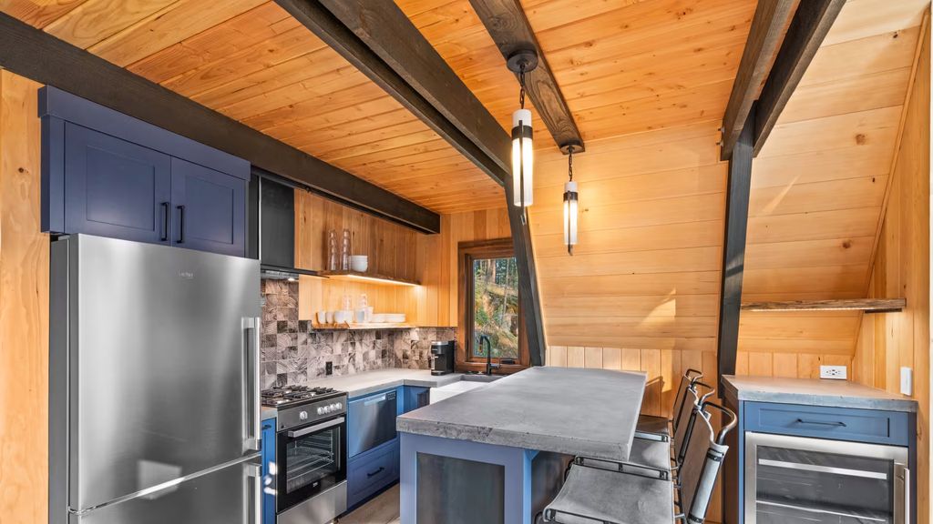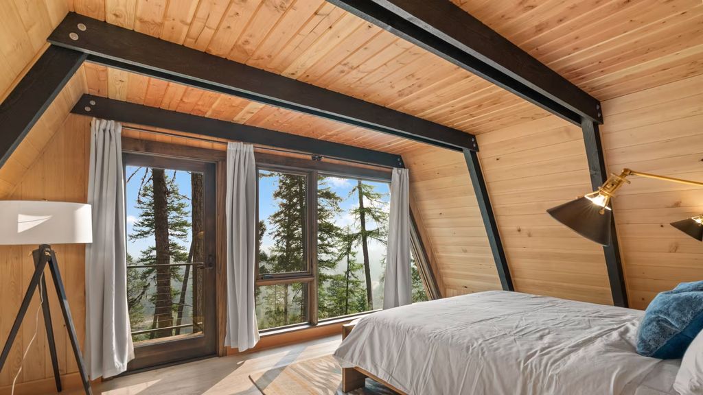 Inside, natural hemlock paneling wraps the interiors, complemented by exposed wood beams that trace the vaulted ceilings. Large windows frame uninterrupted views of the surrounding forest and mountain landscape, while a live-edge wood dining table anchors the main living space, reinforcing the home’s organic aesthetic.