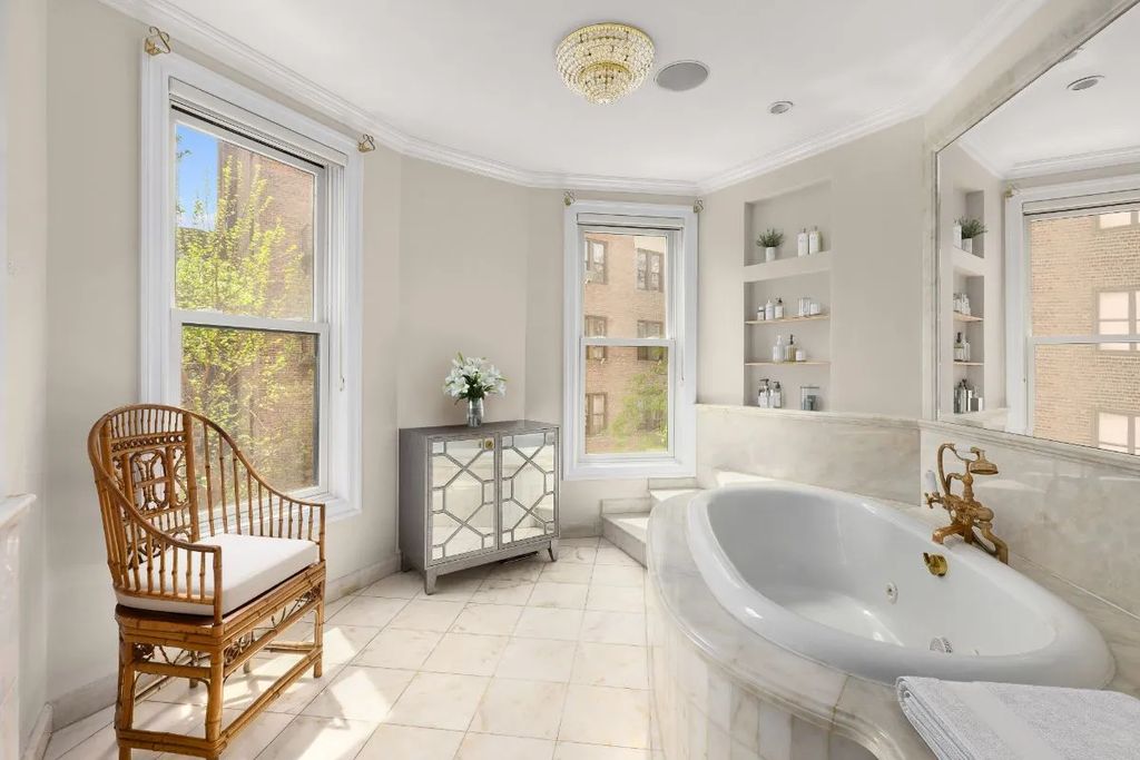 One of the home’s most dramatic features is the primary suite, which enjoys abundant natural light through a bay window. The suite includes a dressing area, a walk-in closet, and a luxurious bath complete with marble and copper finishes. The spa-like bathroom features a jacuzzi tub and steam shower, offering a retreat from the intensity of city life.