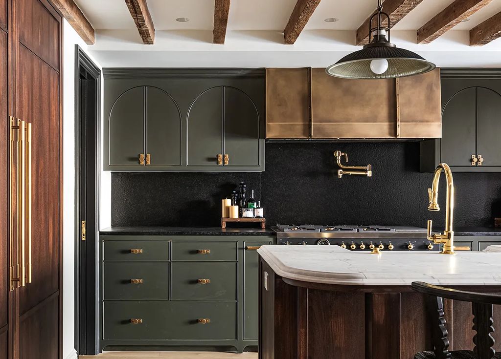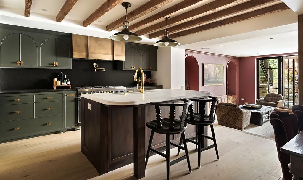 Inside, the sense of craftsmanship is evident from the moment one steps through the door. The first floor begins with a welcoming hallway that leads past a guest bedroom and bath into a kitchen framed by exposed wood beams. This space is fitted with dark green cabinetry, a large eat-in island, and high-end appliances from Bertazzoni and Sub-Zero. A butler’s pantry and breakfast nook offer additional charm, blending practical design with sophisticated comfort.