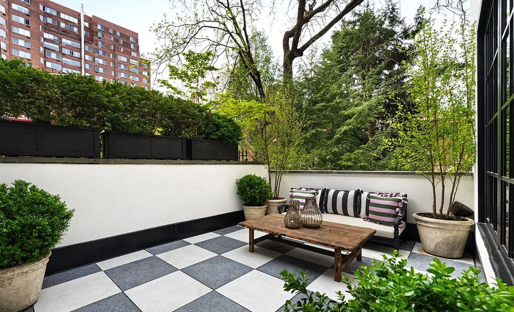 At the rear, a rosy-colored media room opens directly to a landscaped patio equipped with an outdoor kitchen. Beyond the patio, a lush garden unfolds—a serene escape in the middle of Manhattan. The relationship between these indoor and outdoor spaces reflects Pei’s architectural belief that light, color, and geometry should work together to create emotional resonance.