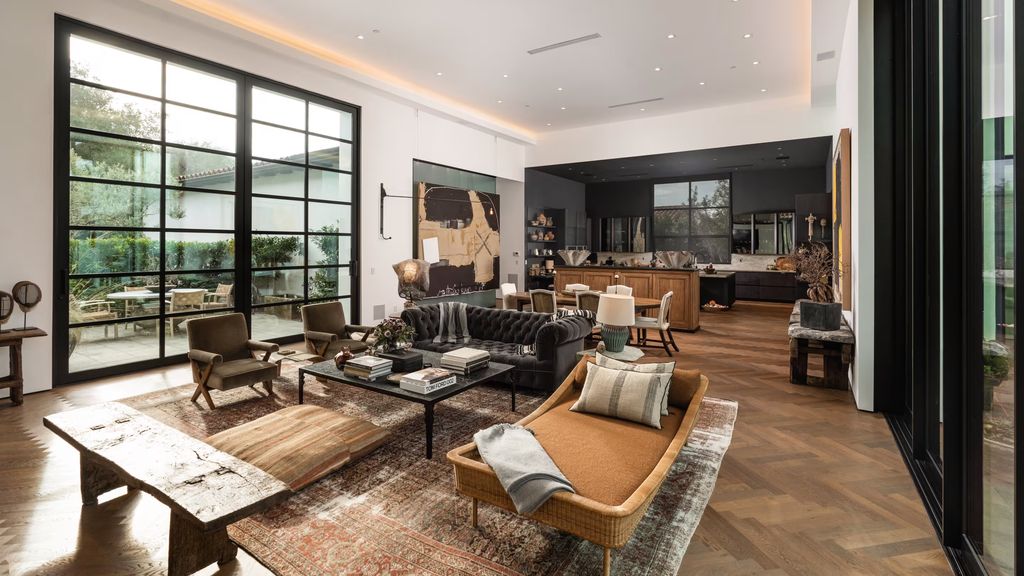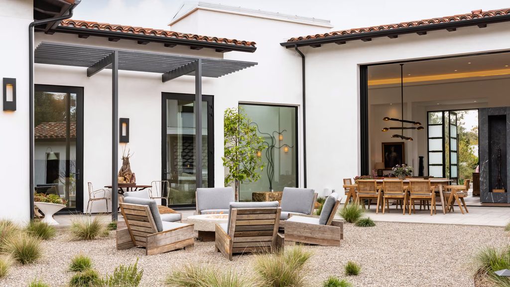 Completed in 2018, the residence spans approximately 4,780 square feet and offers a contemporary interpretation of Mediterranean architecture. Clean lines, black steel-framed doors and windows, and an emphasis on natural light define the home’s aesthetic.