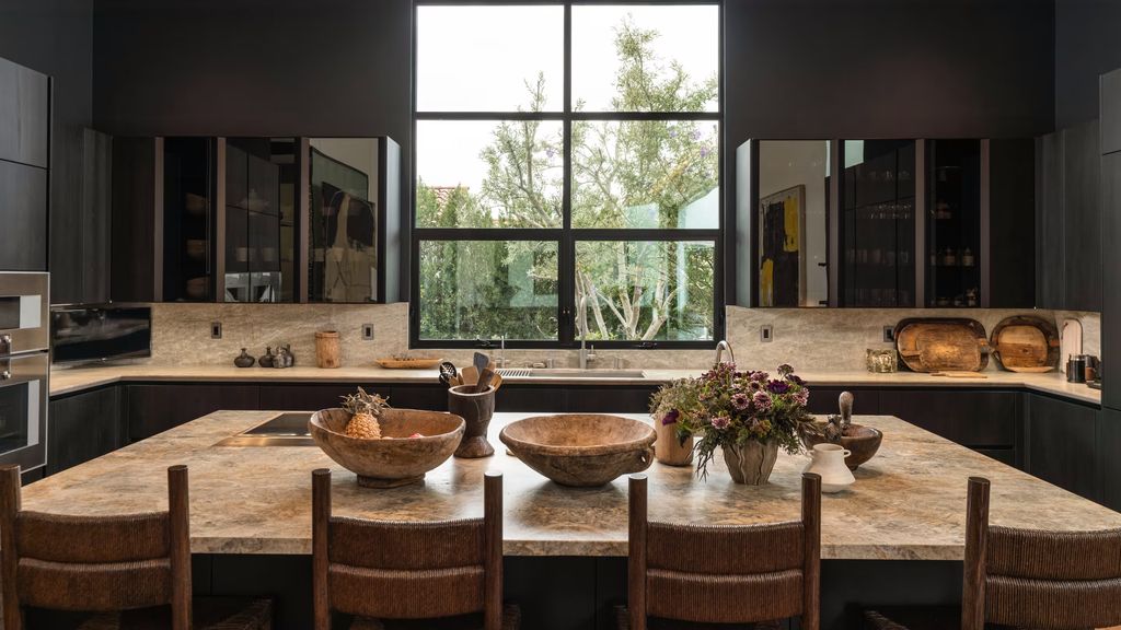 The home includes four bedrooms and four bathrooms, arranged across two private wings flanking the main living space. At the heart of the residence is a stylish eat-in kitchen, outfitted with mirrored cabinetry that reflects light and greenery from outdoors.