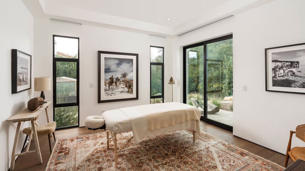 Additional amenities include wine storage, a massage treatment room, a billiards area, and several spaces for outdoor dining and lounging. A detached studio offers flexibility as a gym, office, or guest house.