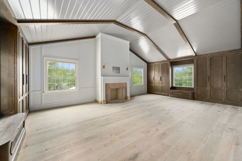 The estate’s architecture speaks to a refined aesthetic rarely found in modern luxury homes. The main residence, a stately four-bedroom Georgian-style structure, showcases herringbone oak and brick floors, arched doorways, and creamy marble fireplace surrounds. Inside, every room reveals thoughtful design, from the sunlit solarium to the paneled library and a cozy playroom that balances family comfort with grand entertaining spaces.