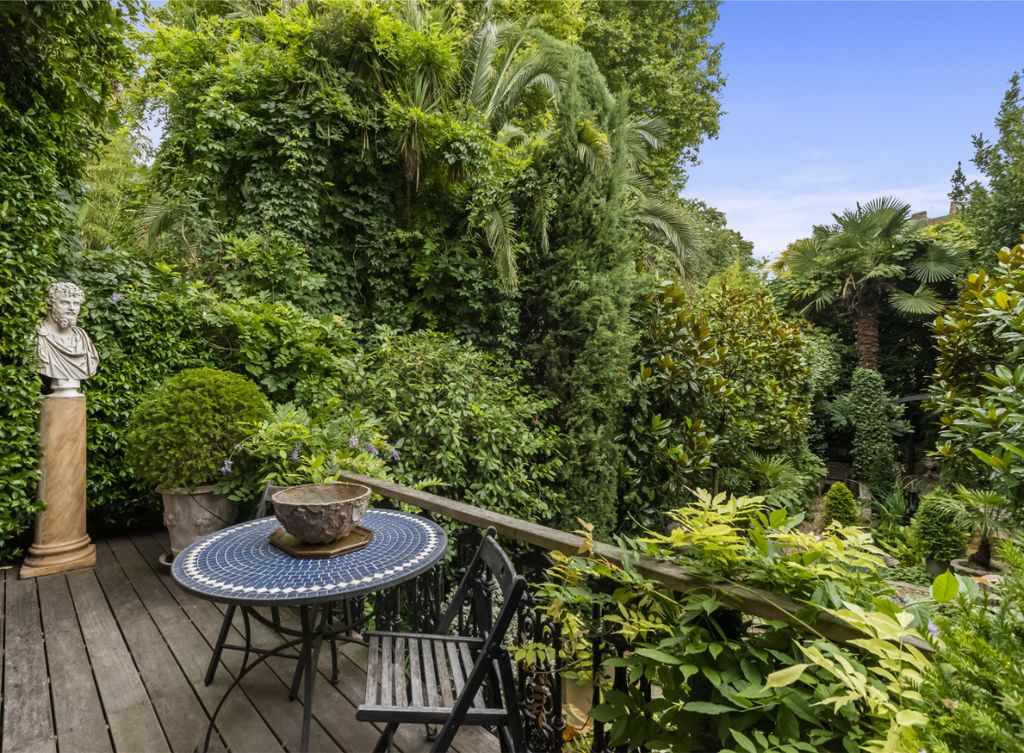 Over the following years, Martin used his architectural background to reimagine the layout, creating a seamless flow between indoors and out. The garden was lowered to the level of the bedrooms, planted with palms, camellias, and bay trees around a symmetrical water feature. The result is a lush, private oasis—a rare find in the heart of London.