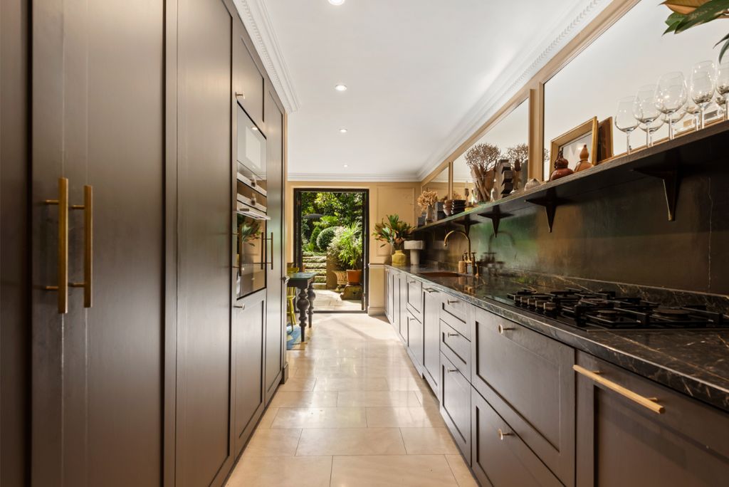 The two-bedroom, two-and-a-half-bath home spans approximately 1,530 square feet and strikes a careful balance between historic character and contemporary craftsmanship. The dramatic reception room remains the focal point, complemented by a bespoke kitchen and dining area on the main level. Below, both bedrooms open onto a winter garden; the primary suite features a polished en suite bathroom and ample built-in storage.