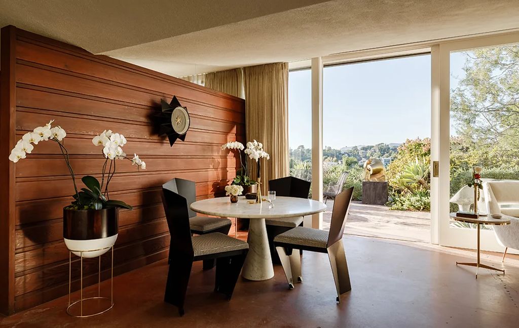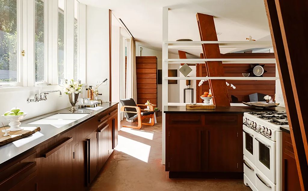Inside the circa-1948 footprint of 1430 Avon Terrace, the house measures roughly 1,300 square feet and contains three bedrooms and a single bath—modest dimensions that emphasize proportion and detail over volume. Clerestory windows introduce indirect northern light, while sliding glass doors at either end of the living space create a strong indoor-outdoor connection. The kitchen retains period character with black phenolic resin counters, handmade tile, and a vintage O’Keefe & Merritt range; original built-ins and wood panelling help maintain continuity with Lautner’s material palette. An architect who consulted on the project told californialuxuryhouses that “the restoration strikes a rare balance: it preserves the original intent while allowing the home to function for contemporary life.”