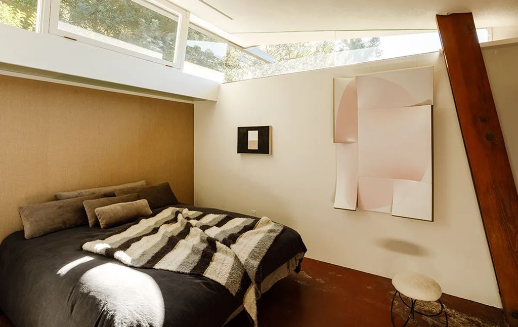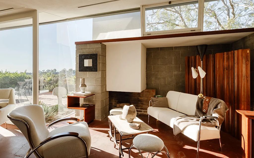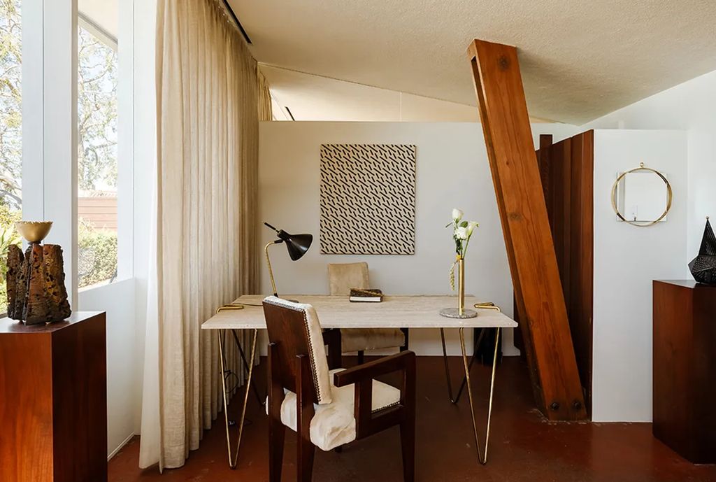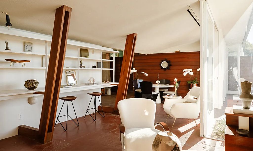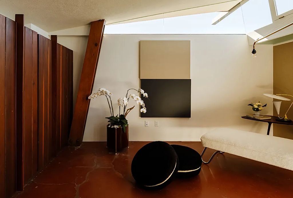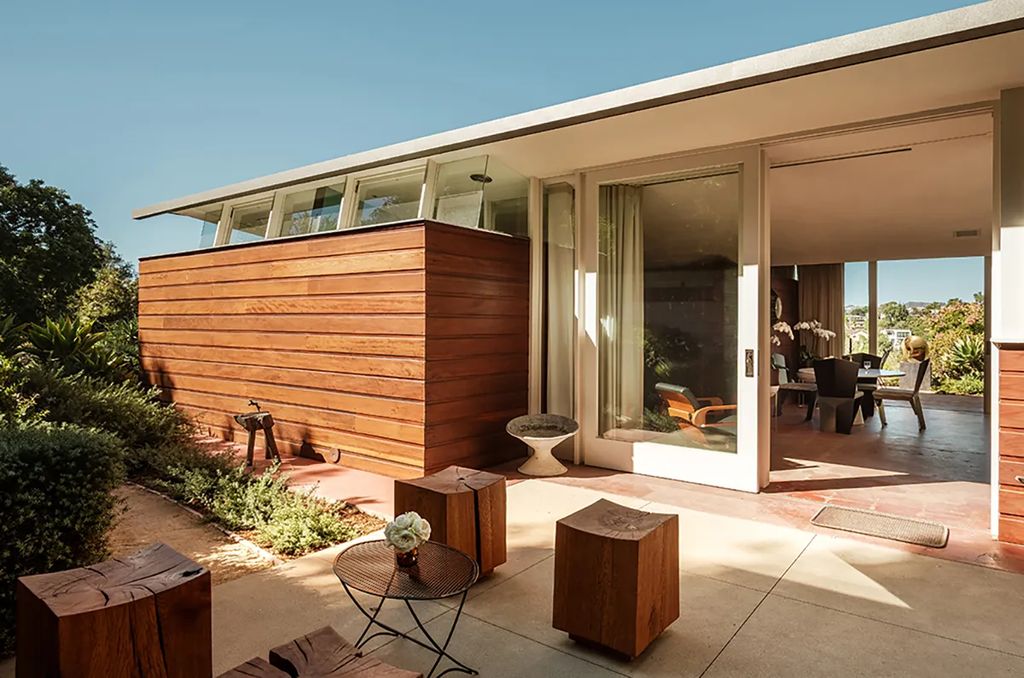 The restoration—executed in close collaboration with architect Barbara Bestor—went well beyond surface improvements. At 1430 Avon Terrace, crews waterproofed the structure, stabilized and lifted a sagging foundation, reconfigured a 1960s bedroom addition to better respect the original plan, and painstakingly uncovered the red concrete floors characteristic of the period. Redwood board-and-batten siding was sanded and refinished to restore the home’s warm exterior expression. “This was never a cosmetic flip,” co-listing agent Mark H. Mendez said. “It was a deliberate, research-based preservation project that honored Lautner’s early language.”