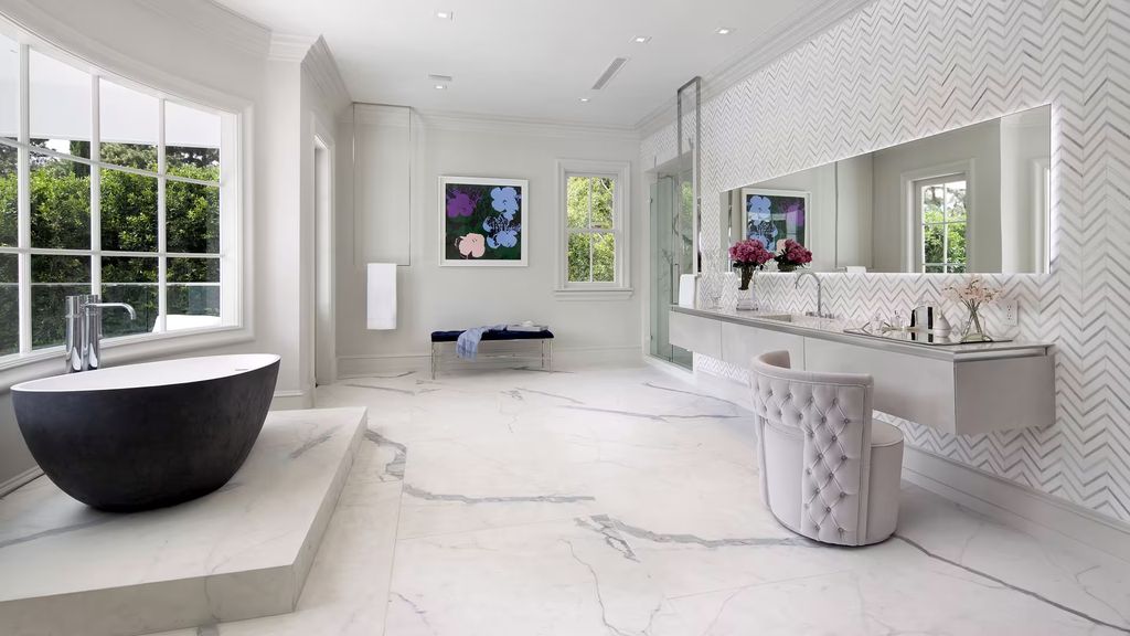 At the rear of the estate, covered walkways lead to a striking black-and-white striped pool deck, a visual signature that mirrors the bold yet controlled aesthetic found throughout the interiors. According to sources familiar with the renovation, these outdoor spaces were intentionally designed to accommodate both large-scale events and more private moments away from public view.