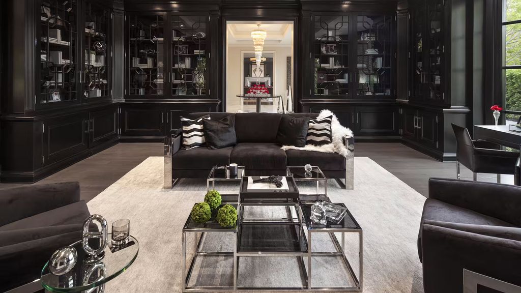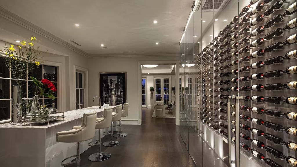 Inside, the residence features an open-plan living area framed by 10 sets of French doors, allowing natural light to pour into the interiors while maintaining a seamless connection to the outdoor entertaining spaces. A paneled library, a temperature-controlled wine cellar with an adjacent bar, and a glossy black formal dining room add layers of sophistication throughout the home.