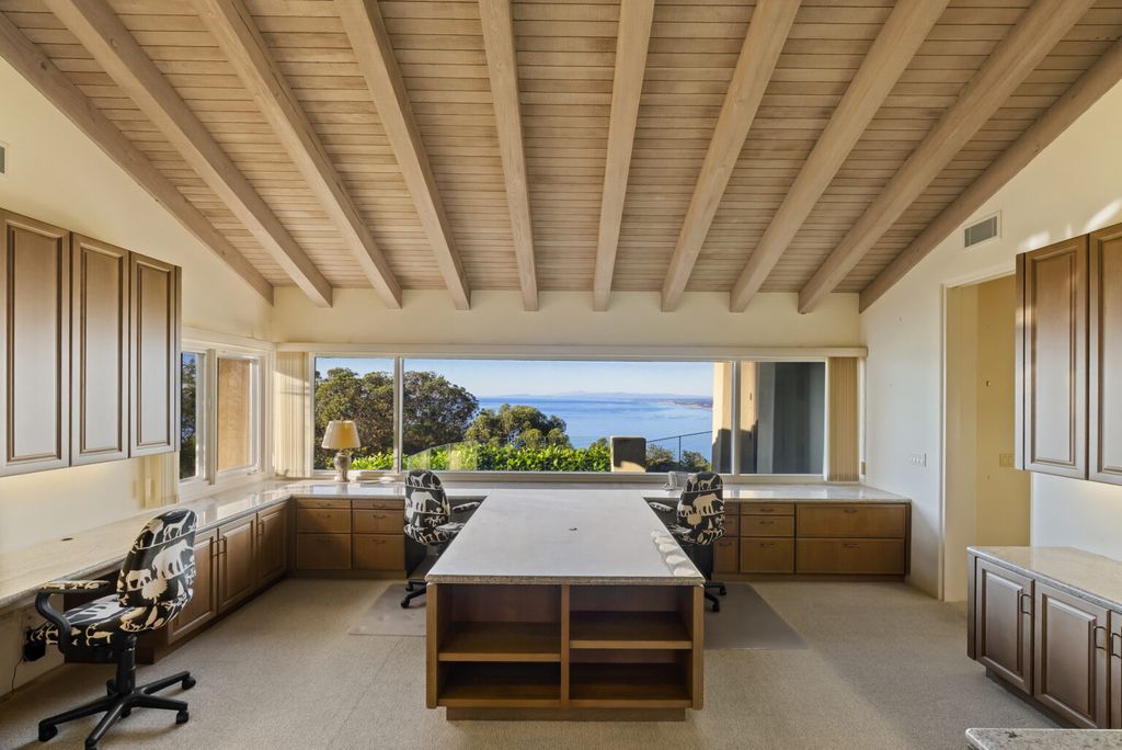 Positioned higher on the hillside, the tower office features warm wood finishes and a horizontal picture window framing uninterrupted ocean views. This elevated creative space has since been designated as a historic structure by the City of San Diego.