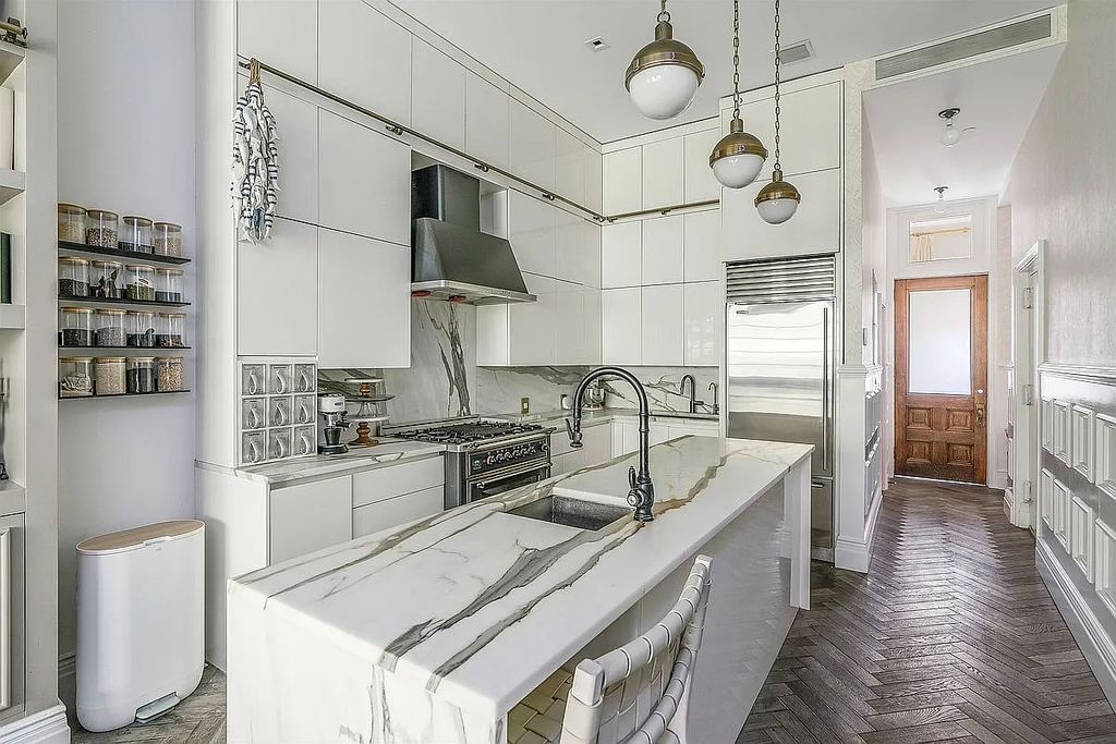 At the center of the main level sits a chef-oriented kitchen wrapped in dramatic marble surfaces extending from countertops to full-height backsplash walls.