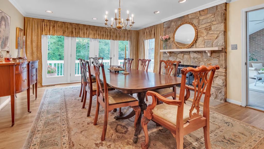 Adjacent to the kitchen is an informal dining area, while a separate formal dining room offers a more traditional setting, anchored by a wood-burning stone fireplace. According to the listing, these spaces were frequently used for family gatherings over the years, reinforcing the home’s reputation as a place designed for connection rather than spectacle.