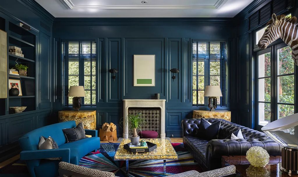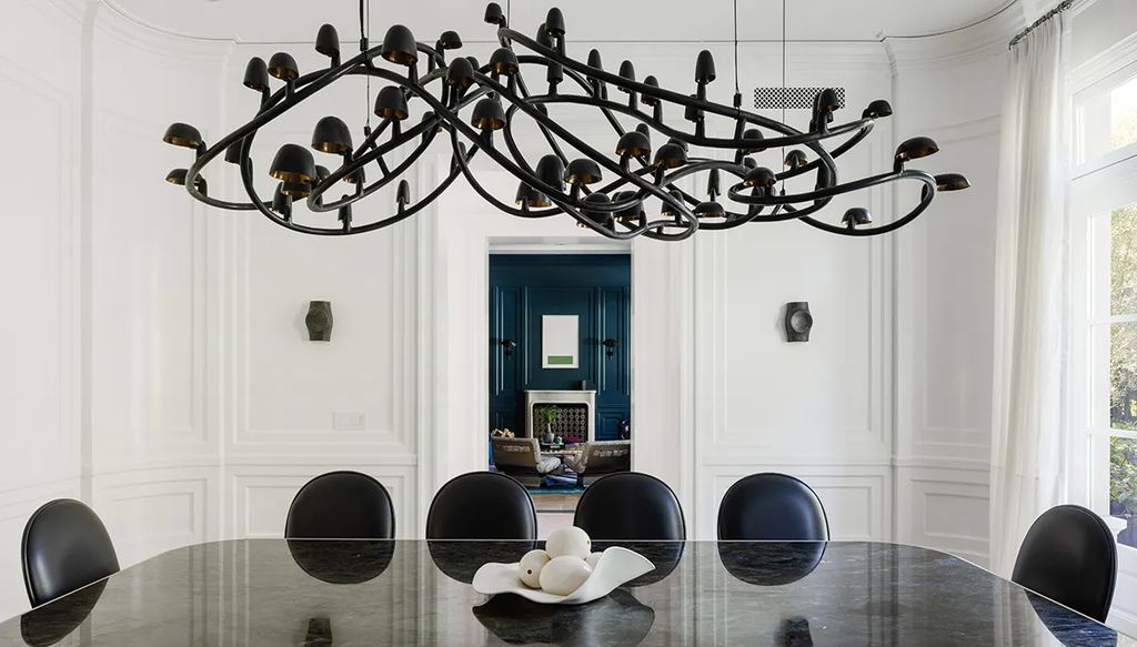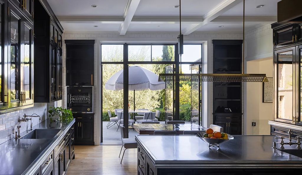 The interiors unfold into a formal dining room illuminated by a custom Studio Molen chandelier and a striking library wrapped in lacquered blue walls. The gourmet kitchen brings a sophisticated contrast with black-toned cabinetry, subway tile, bronze fixtures, and a statement La Cornue range that anchors the space.