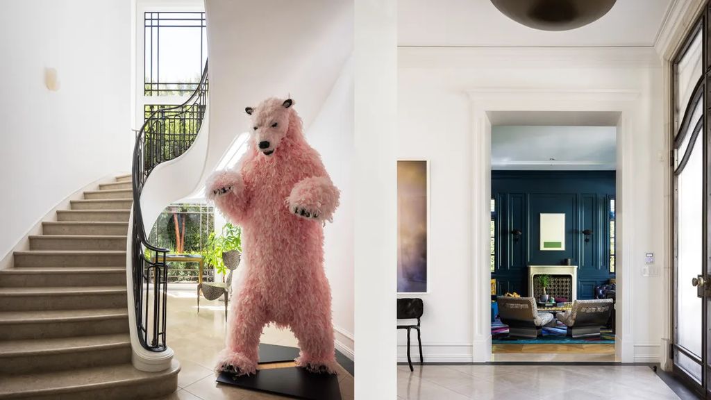 Set on over half an acre and shielded by walls and tall cypress trees, the two-story main house creates a sense of privacy from the moment guests arrive. Reeded-glass entry doors open to a dramatic foyer, where a whimsical feathered pink bear by Italian artist Paola Pivi immediately establishes the home’s creative tone.