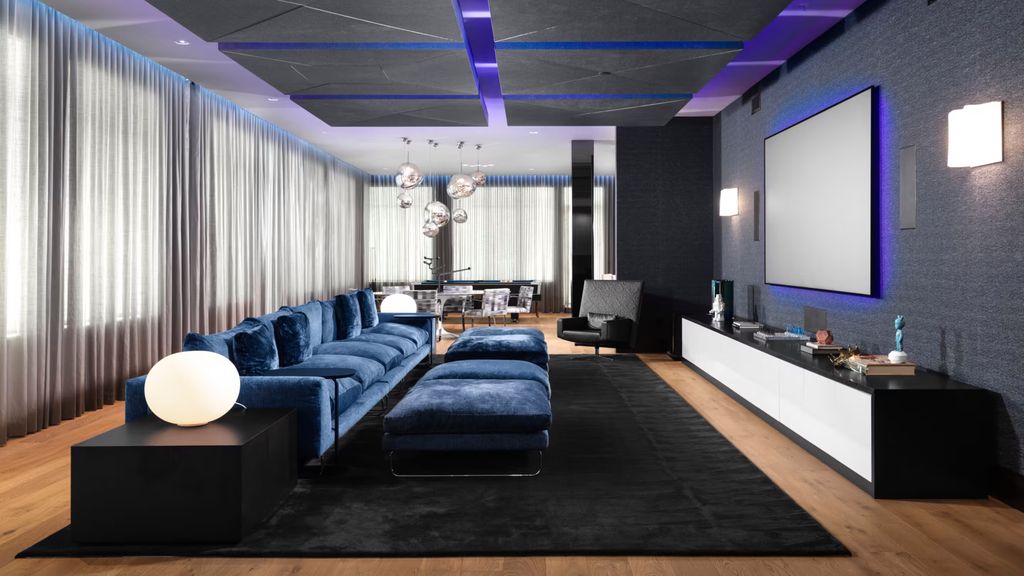 Smart home technology and acoustic systems from brands such as Crestron, Sonance, and Vicoustic were integrated throughout the residence, underscoring a commitment to both luxury and performance.
