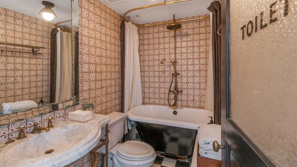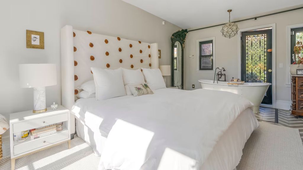 The primary suite occupies the upper level, complete with a soaking tub positioned to catch soft morning light. Gorder once described this part of the home in interviews as her “quiet hour,” a place where the city’s noise dissolves into the background. The suite’s terrace, framed by vines and planters, carries the ambiance of a small European courtyard.