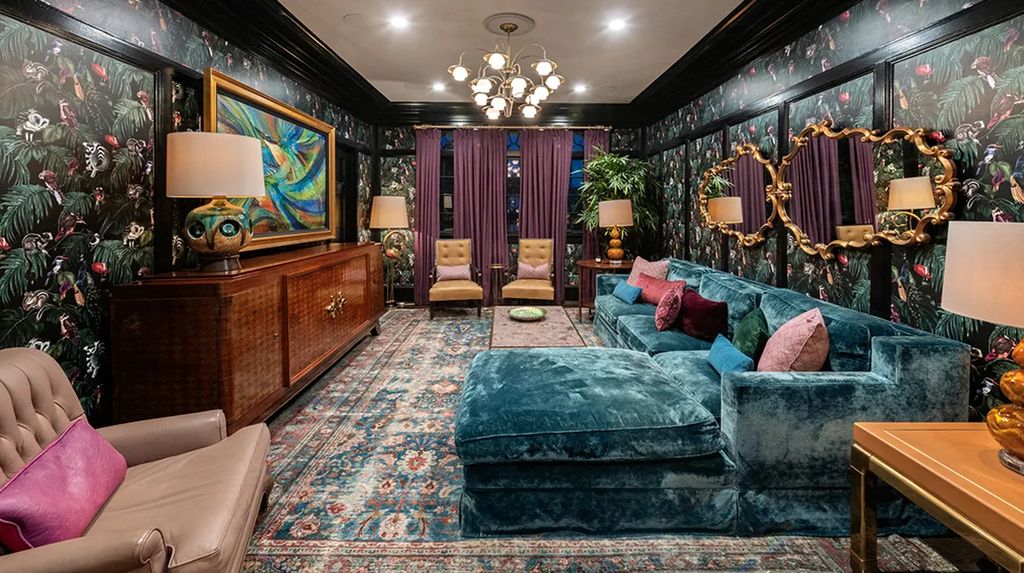 Moving to the upper levels reveals a series of richly imaginative spaces, including an eclectically wallpapered den that reflects the house’s creative lineage. The full-floor primary suite offers two distinct baths, each with an unmistakable personality. One incorporates a steam shower and a barber’s chair—an indulgent nod to vintage grooming rituals—while the other is anchored by a hand-blown glass chandelier and a stainless soaking tub, creating a contemporary spa environment with an artistic edge.