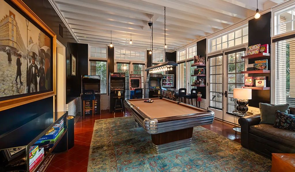 The main floor includes several rooms imagined for leisure and social gatherings. A game room lined with vintage arcade machines opens to the backyard through tall French doors, welcoming the California sun into its playful, lounge-like environment. The kitchen is a chef-caliber space defined by marble countertops, shaker-style cabinetry, and a split-level eat-in island that subtly encourages everyday togetherness. Top-tier Miele and Thermador appliances complete this culinary showcase.