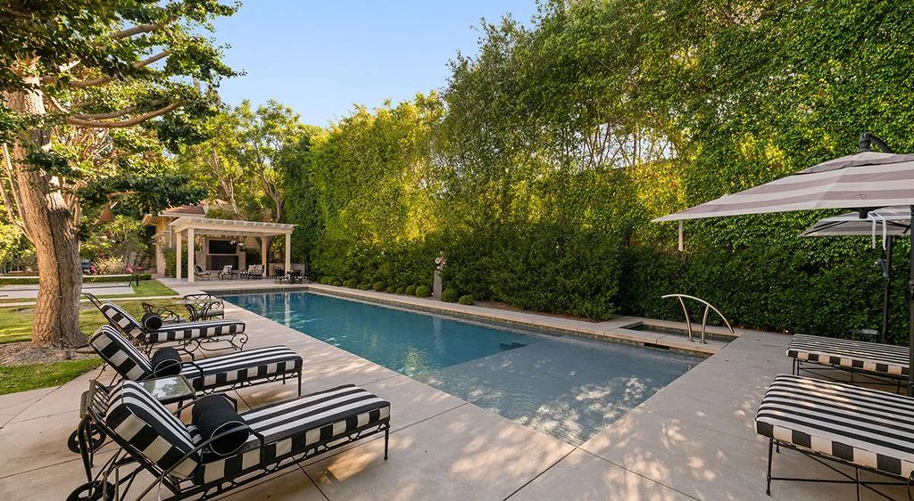 Outside, the grounds extend the narrative of leisurely luxury. A rectangular swimming pool with a Baja shelf sits beside a fireside cabana, while herb gardens, mature trees, and manicured lawns introduce an organic softness to the architectural symmetry of the property. A built-in outdoor kitchen and generous dining terrace encourage long afternoons under the open sky. The pickleball court adds a modern lifestyle amenity, and a separate guesthouse—complete with its own kitchen—sits above the three-car garage, offering an ideal retreat for extended family or long-term guests.