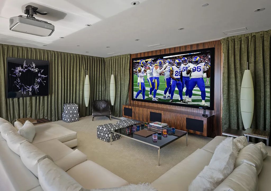 A marble-clad island anchors the sleek kitchen, complete with top-of-the-line Miele appliances and a butler’s pantry for effortless entertaining. The primary suite crowns the top level, featuring its own fireplace, private office, and spa-style bath with a soaking tub and steam shower. On the lower level, a lounge and full bar lead to a movie theater that opens directly to the outdoors, blending luxury living with cinematic flair.
